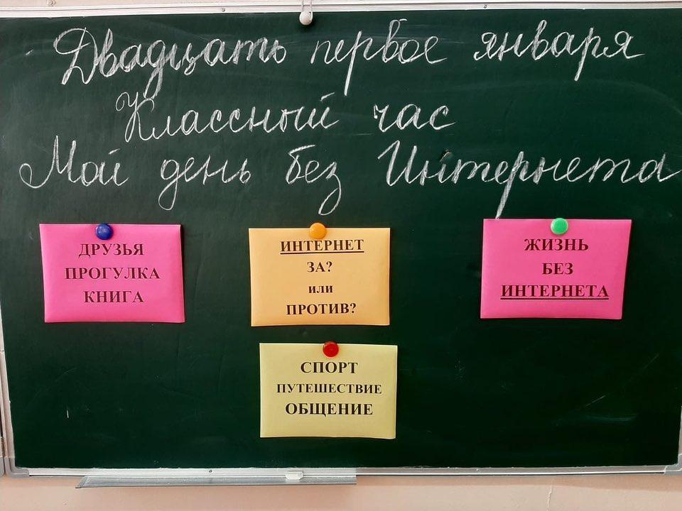 В рамках Республиканской широкомасштабной детской акции посвящённой Международному дню без интернета, сегодня 21.01.2020г проводились классные часы на тему: «Мой день без интернета». Цель часа: профилактика интернет зависимости, повышение культуры пользования Интернет ответственности взрослых пользователей, Интернет-услуг в отношении контроля за Интернет- активностью несовершеннолетних.