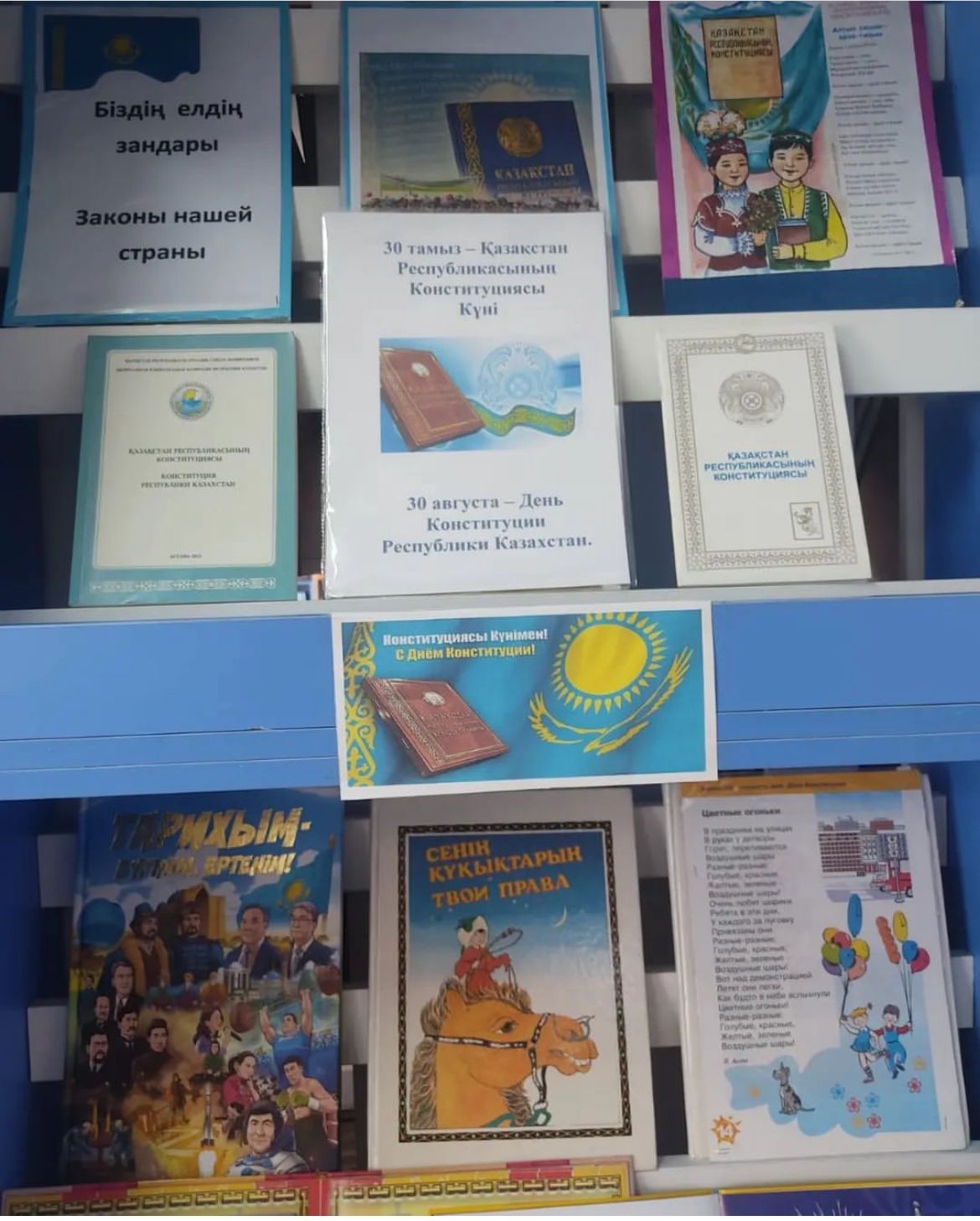 30 августа мы ежегодно отмечаем "День Конституции Республики Казахстан". Дата была выбрана не просто так. Именно в этот день в 1995 году на общенациональном референдуме был принят основной закон Независимого Казахстана. Последующие изменения и дополнения вносились в Конституцию в 1998г, 2007г, в 2011г. Первой статьей Конституции Республика Казахстан утверждает себя демократическим, светским, правовым и социальным государством, высшими ценностями которого являются человек, его жизнь,свобода. В честь праздника дня Конституции проводилась Книжная выставка-диалог «Конституция Казахстана - сквозь призму времени».