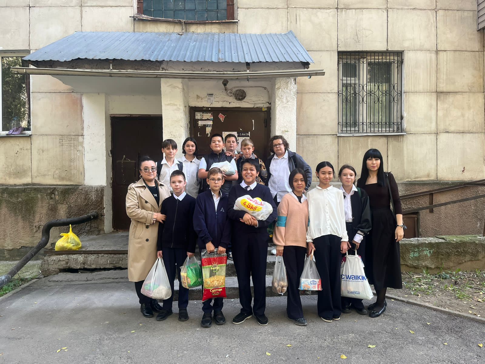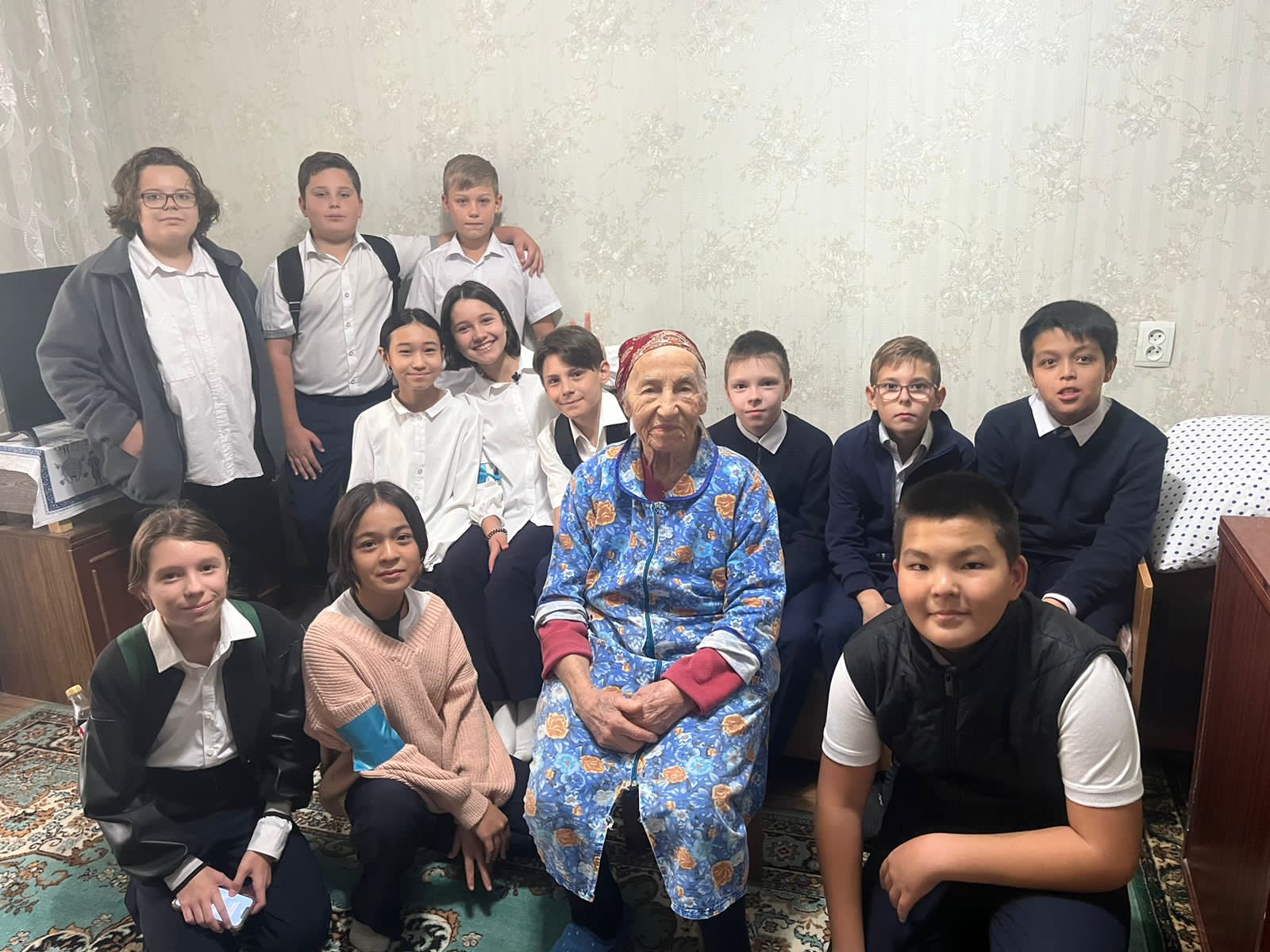 В целях воспитания у учащихся чувства уважения, внимания, отзывчивости и заботы к пожилым людям учащиеся 7Д и 5Ж класса вместе с классными руководителями З.Т. Масимовой и Э.А. Айтбаевой посетили Абсалямову Софию Халиловну и поздравили с международным днем пожилых людей.
