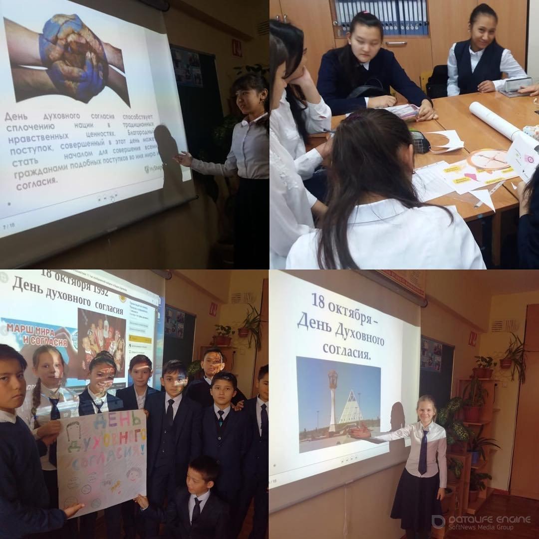 В КГУ ОШ 129 проводился классный час на тему «Независимый Казахстан - страна мира, добра и согласия», посвящённый 18 октября дню духовного согласия. Цель часа: способствовать повышению уровня творческой активности учащихся, воспитывать чувство уважения друг к другу, к обычаям, традициям и культуре разных народов, толерантности, познакомить учащихся с понятием "толерантность”, с основными чертами толерантной личности.