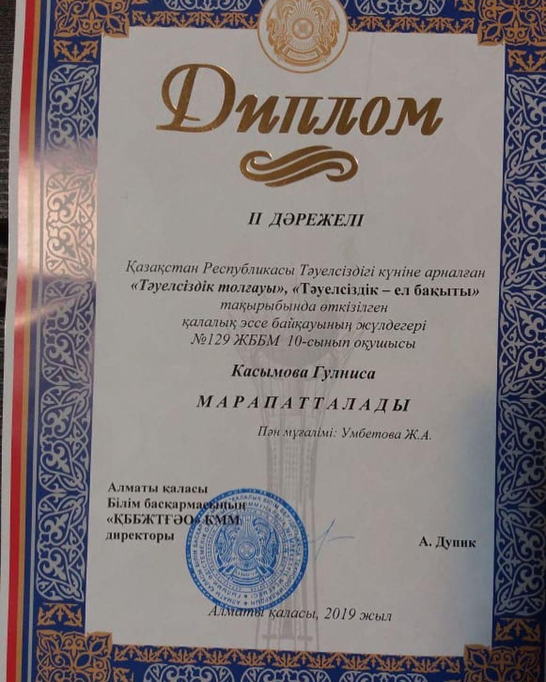 Ученица 10В класса Касымова Гульниса приняла участие в городском конкурсе эссе «Тәуелсіз ел - бақытты!», посвящённый Дню Независимости и заняла II место. Руководитель Умбетова Ж.А., учитель казахского языка и литературы. Поздравляем! Желаем дальнейших успехов!👏👏💐