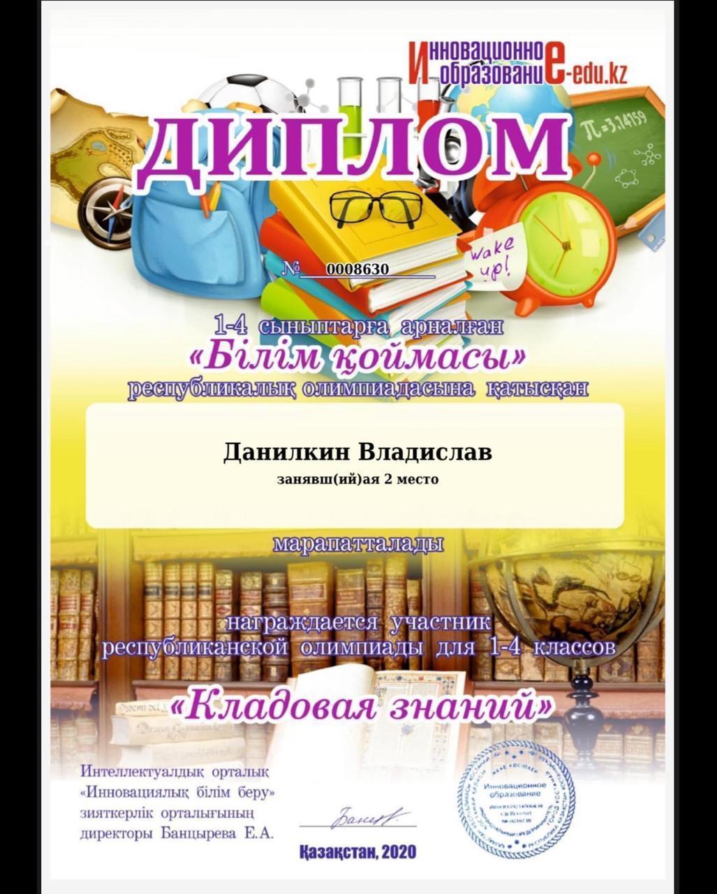 13 қараша 2020 0 1 2 3 4 5 1-4 сыныптарға арналған "Білім қоймасы" республикалық олимпиадасына қатысып 2 орын алған Данилкин Владиславты құттықтаймыз! Осы беттің QR-коды:QR-код этой страницы: