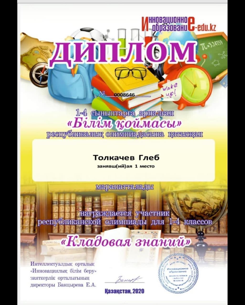 13 қараша 2020 0 1 2 3 4 5 1-4 сыныптарға арналған "Білім қоймасы" республикалық олимпиадасына қатысып 1 орын алған Толкачев Глебты құттықтаймыз! Осы беттің QR-коды:QR-код этой страницы: