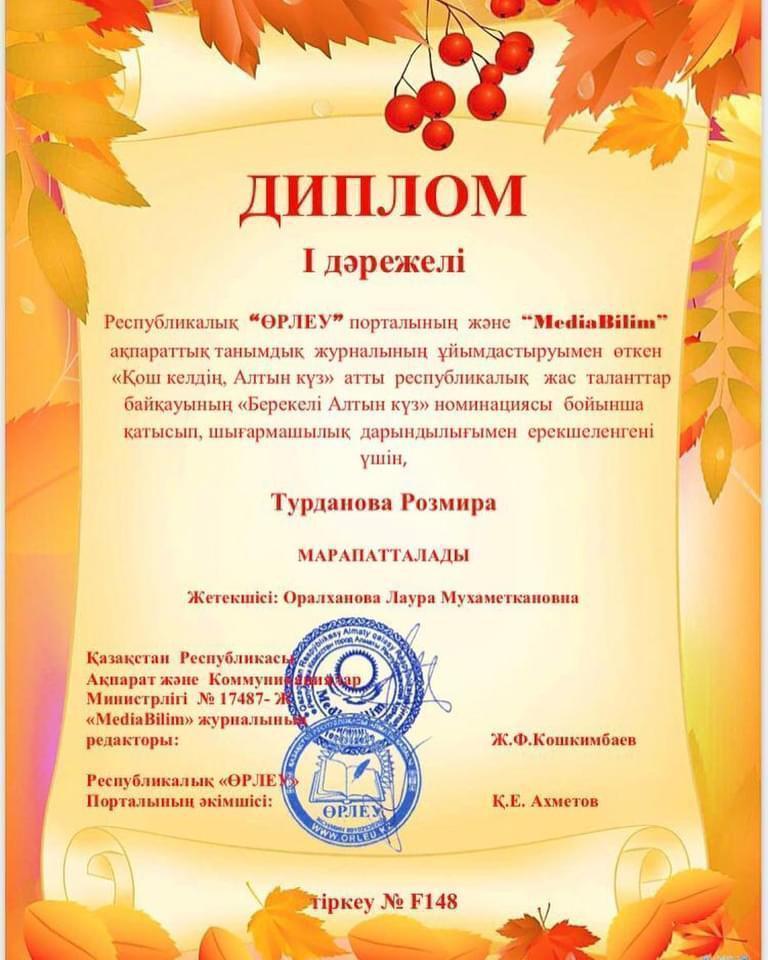Республикалық "Өрлеу" порталының және "MediaBilim" ақпараттық танымдық журналының ұйымдастыруымен өткен "Қош келдің, Алтын күз" атты республикалық жас таланттар байқауына белсене қатысқан Турданова Розмираны құттықтаймыз!!!