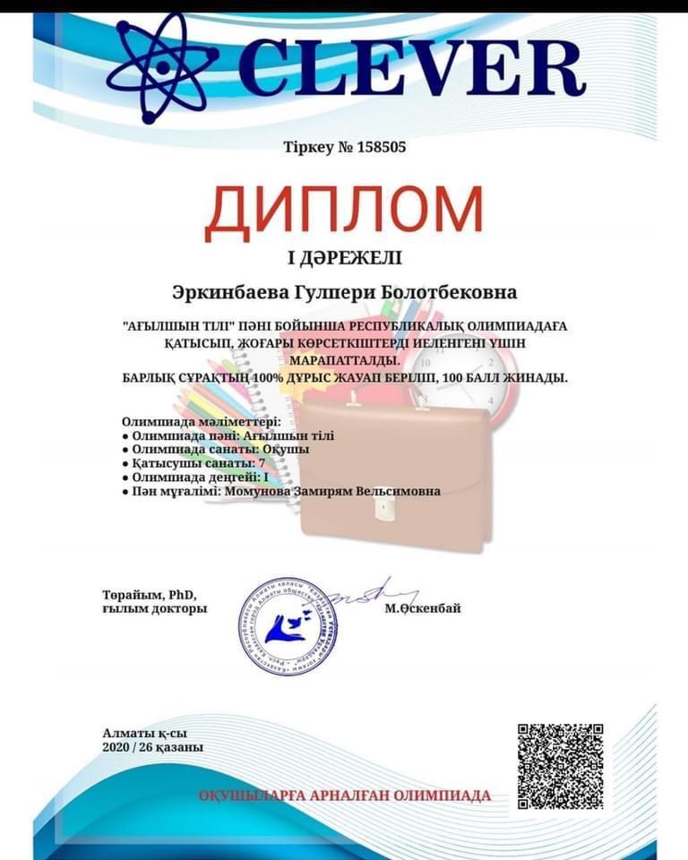 03 желтоқсан 2020 0 1 2 3 4 5 Поздравляем Эркинбаева Гулпери Болатбековна за высокие показатели в республиканской олимпиаде по предмету "Английский язык" Осы беттің QR-коды:QR-код этой страницы: