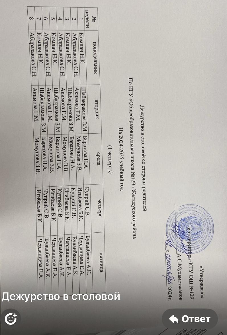 Мектеп асханасын тексеру актісі. 2021 жылдың қыркүйек айы/ Акт обследования школьной столовой. Сентябрь 2021