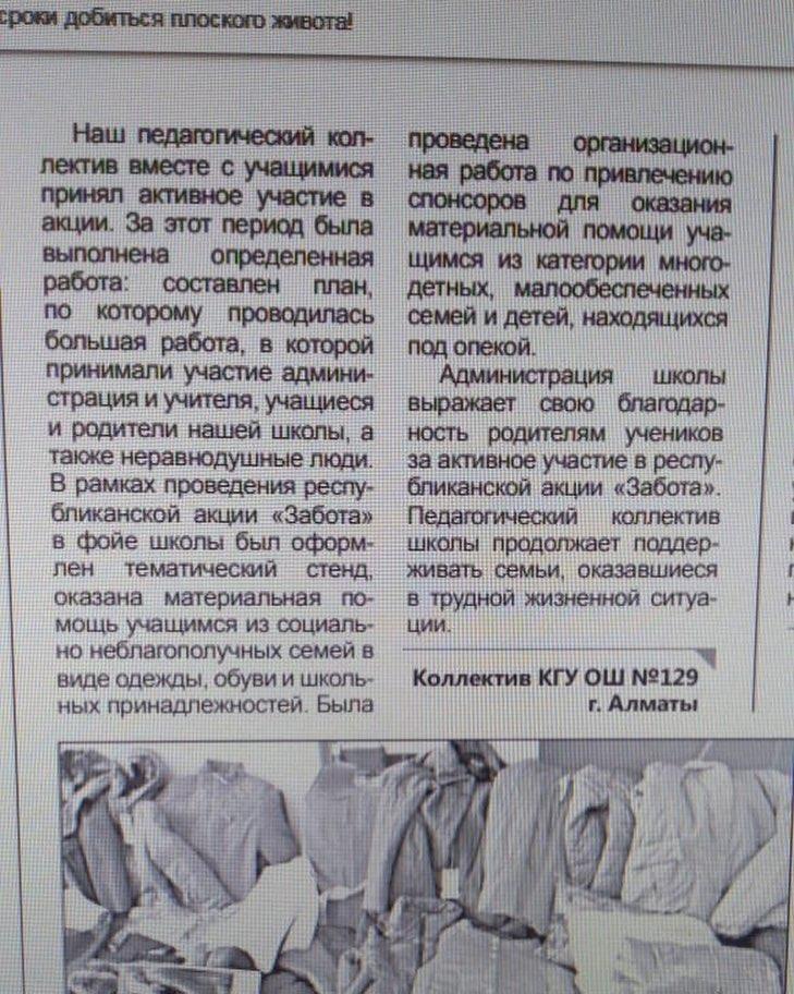 06 ақпан 2019 0 1 2 3 4 5 Акция "Забота" В рамках Республиканской акции «Забота» вышла статья соцпедагога Талиповой Д.М. в рубрике «Во благо других людей» на страницах газеты «Бiлiмдi ел» Осы беттің QR-коды:QR-код этой страницы: